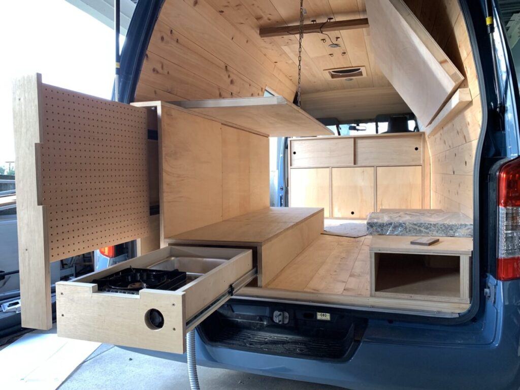 バンタイプの国産車両をベースにカスタムしており、5人乗り、最大宿泊人数5名までご乗車いただけます。どなたでも運転しやすいAT車。ドライブレコーダー、ETC等の基本機能も完備しています。