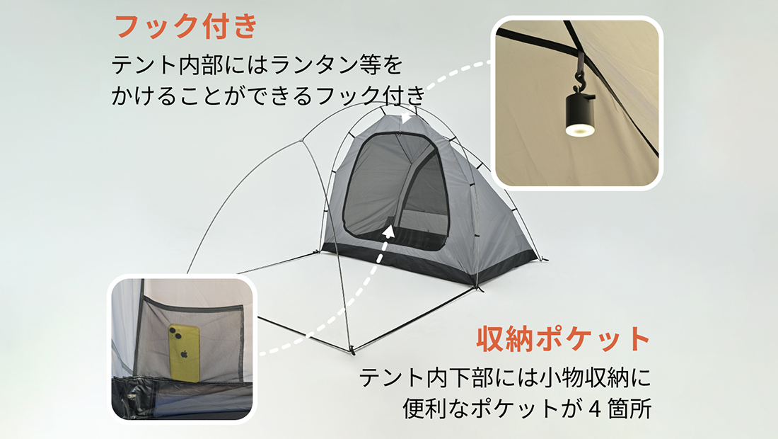 本製品は、バイクキャンプで磨き上げてきた軽量・コンパクト設計と設営のしやすさをそのままに、ジムニーなど積載量の限られた車でのキャンプでも快適に使える高天井と居住性を追求したドーム型2ルームテントです。