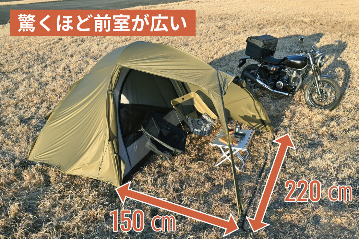 贅沢なスペースでソロキャンプを楽しみたい。夫婦・カップルでツーリングキャンプへ行きたいけど2用テントはバイクに積載できないからあきらめていた。