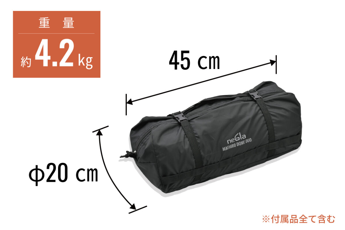 2~3人用なのに収納寸法45×φ20㎝とコンパクト。スーツケースやシートバック、トップケースなどにも楽々収まります。