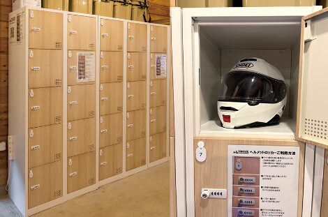 ヘルメットが収納できる、大容量の鍵付きロッカー(幅32cm×高さ33cm×奥行44cm)を無料でご利用できます。