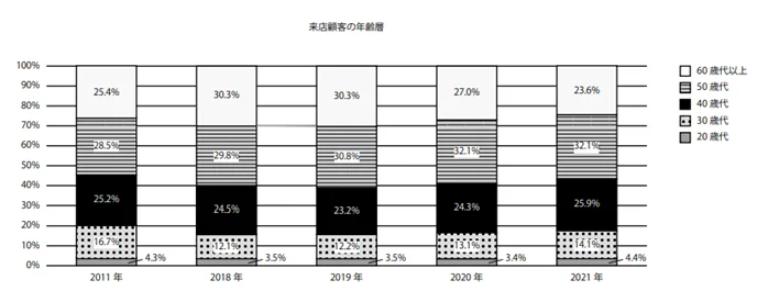 累積保有台数・販売売上総額が過去最高を更新した2021年。実際にどのような層が販売店舗へ足を運ぶことが多かったのかについても調査を実施したところ、割合としては50代以上の世代が50%程度を占めており、次いで40代・30代・20代と続く形になりました。一方で、20~40代ユーザー層の割合は昨年対比で上昇しており、さらにその中でも40代ユーザーの割合増加(昨対比1.6%増加、25.9%)が最も顕著でした。