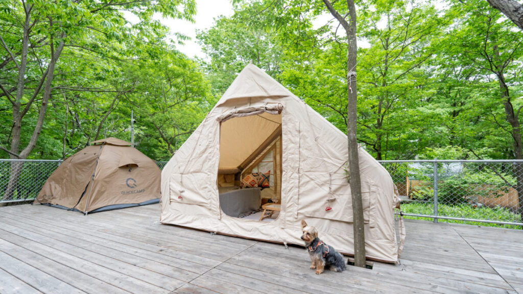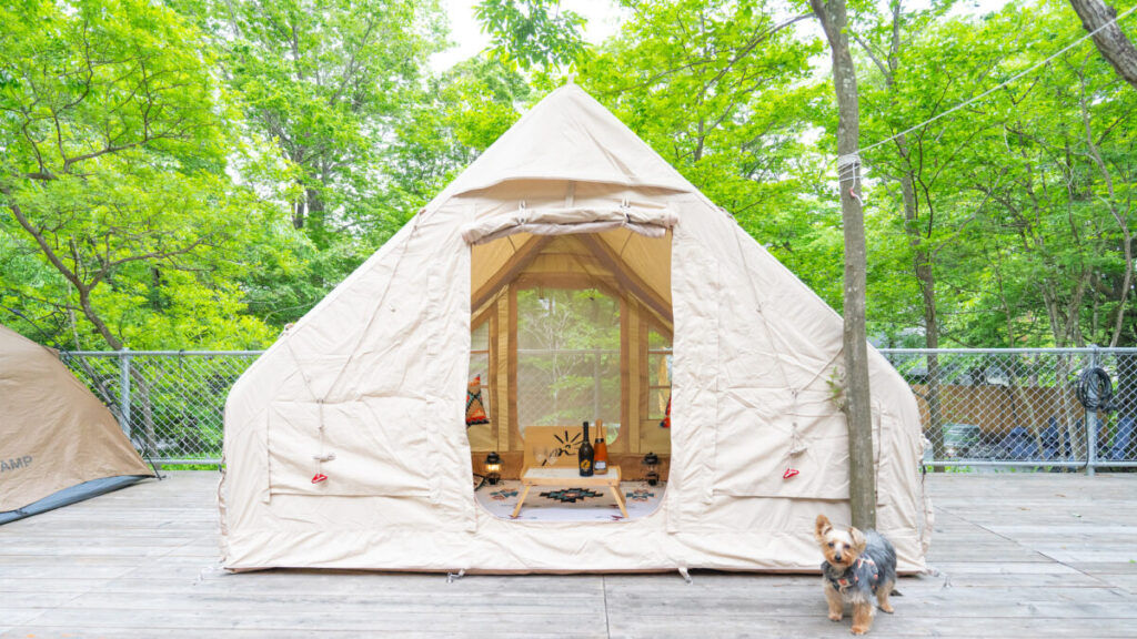 昨年8月に誕生した同施設は、既存のテントよりも大きく広々としたTOMOUNT社の「インフレータブルテント」を貸し出すことで、より快適な滞在を提供している。このテントは、ポールの代わりに空気を入れるエアーテントなため設営が簡単。テントの設営が苦手な人でも安心だ。さらに、絨毯・ミニテーブル・クッションなどの小道具も貸出している。