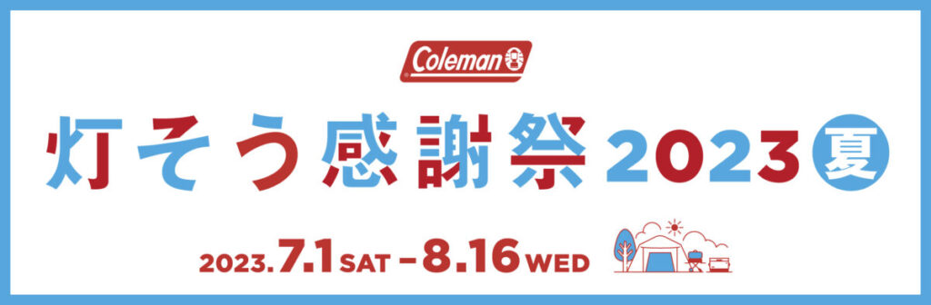 ニューウェルブランズ・ジャパン合同会社コールマン事業部(以下略:コールマン)は、「灯そう感謝祭 2023夏」を、2023年7月1日(土)から8月16日(水)にて開催します。対象商品を購入すると先着で灯そう感謝祭限定のノベルティがもらえるフェアや抽選会、SNSキャンペーンなど夏のキャンプを後押しするコンテンツをご用意しております。