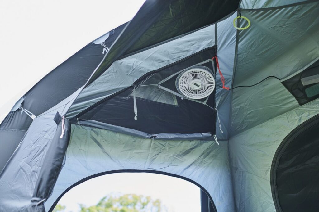 夏のキャンプに最適な2ルームテント「タフスクリーン2ルームエアー/MDX+」または「タフスクリーン2ルームエアー/LDX+」のご購入でオリジナルカラーのリバーシブルファンベンチレーションを先着2000名様にプレゼント。ファンを使用することで、外気を取り込みこもった熱や湿気を排出し、更にテント内を快適にします。