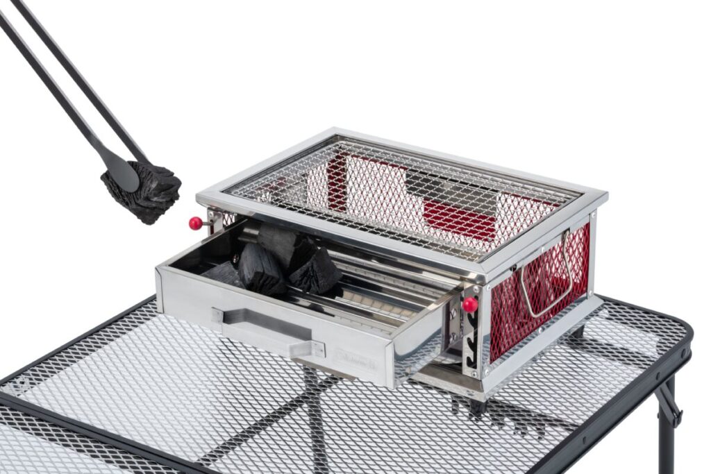 さらに、従来のクールスパイダープロシリーズの機能を踏襲しているので、焼き網の高さを変更して火力をコントロールすることができます。かつ、調理の途中でも炭の継ぎ足しが簡単に行える引き出し式のロストルで、常に最適な火加減を保つことができるのが特長です。