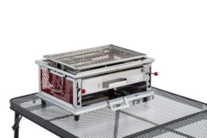 炭の熱を有効活用した、簡易オーブン機能付きのテーブルトップグリルです。上と下で同時に調理を行えるため、上でBBQをしながら、下でトーストや冷凍ピザを簡易的に焼き上げるなど、省スペースで手軽に複数の調理が可能です。
