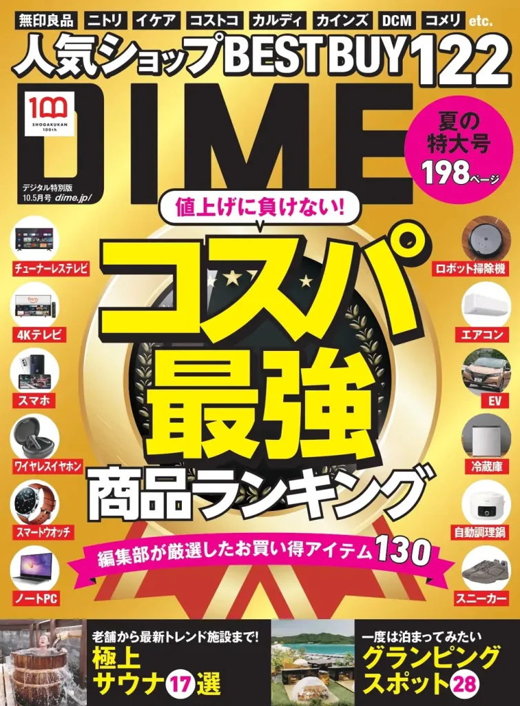 今回は、8月10日(水)に配信される雑誌「DIME」の電子版増刊号(約200ページ)をまるごと1冊読めるQRコードが同梱されるほか、「DIME FOLDING STOOL」を収納できる専用袋ももれなく付いてくる。