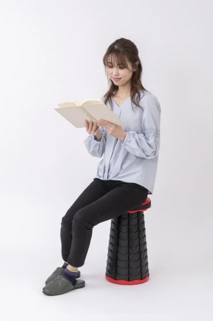たたんだ状態の「DIME FOLDING STOOL」の高さは6.7cm。最も高い状態で45.5cmまで、10段階で高さ調節できる折りたたみ式の椅子だ。耐荷重はなんと150kg。見た目はスタイリッシュだが、しっかりした作りになっている。