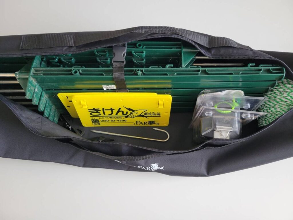 15分程度で設置でき、乾電池(単一)2本で使用可能で、外周約50メートルを囲うことが可能。