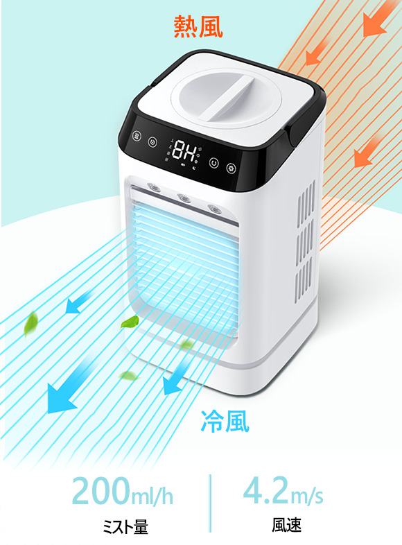 「ZeroCooler」は水と氷を入れることで、出口の風の温度を最大で10℃※(入り口の温度に比べて)下げられます。さらに、ミスト放出量は1時間で最大約200mL、風速は最大で4.2m/s、部屋を素早く涼しくしてくれます。