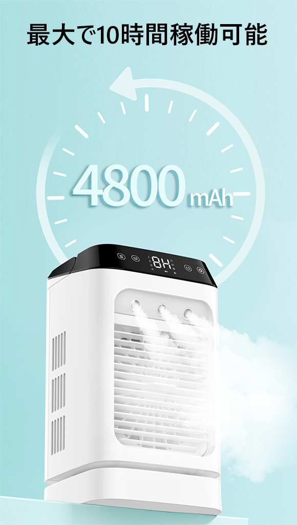 「ZeroCooler」は4,800mAhの大容量バッテリーを内蔵しており、フル充電の場合、低速モード(ミストなし、首振り機能オフ)では最大で約10時間稼働可能。