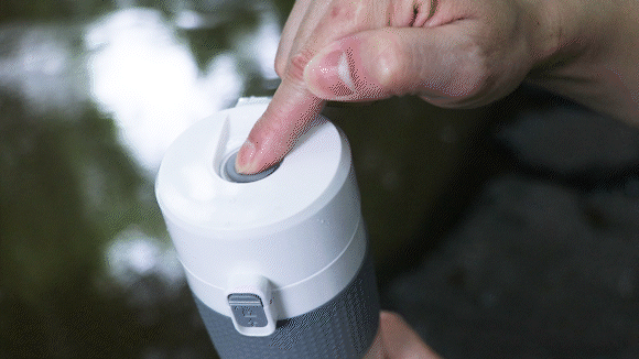 「Aozora」の蓋上部はUVC光ボタンになっており、水を入れたら2秒間長押しするだけで除菌開始!