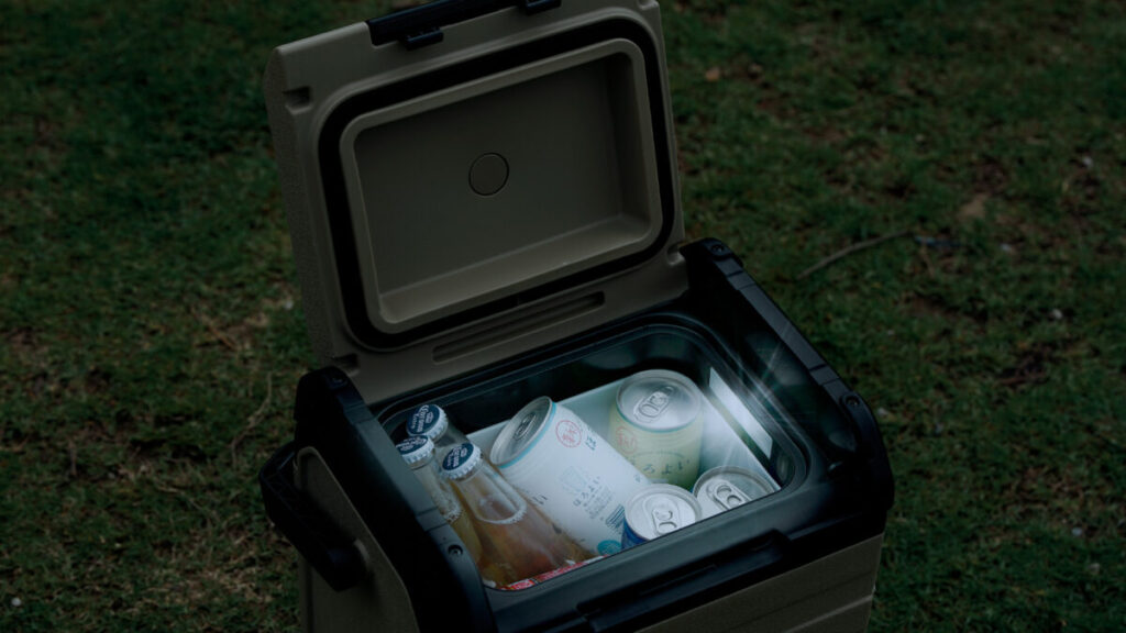 車の座席足元に入れるコンパクトサイズで、停車中に運転席側から片手で物を楽に取り出せます。本体は約6kgで女性が片手でも持ち上げ、アウトドアでの移動が楽です。ボディーの周りに保護カバーが付き、耐摩耗性や耐衝撃性に優れ、最大30°の傾斜に対応可能です。