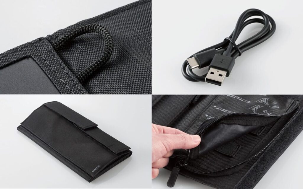 折りたためる3パネル仕様で、持ち運びが容易です。さらに、充電ケーブルやモバイルバッテリーなどを収納できるポケットも付いています。