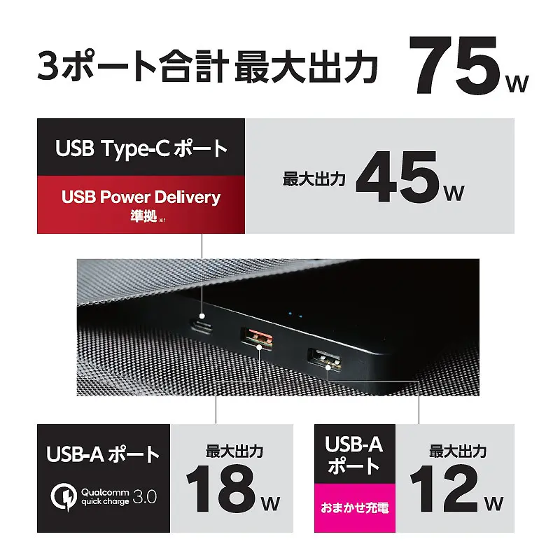 出力:USB-Aポート/12W(5V・2.4A)、USB-A(Quick Charge3.0)ポート/18W(5V・3A、9V・2A、12V・1.5A)、USB Type-C(USB-C)ポート/45W(5V・3A、9V・3A、12V・3A、15V・3A、20V・2.25A)、3ポート合計/最大75W(※3)
