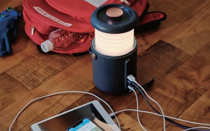生活空間になじむ色、質感に仕上がり、高さ約16cm(ランタン収納時)、重さ約1.7kgと持ち運び・収納に便利です。日中にソーラー充電器とモバイルバッテリーやポータブル電源をケーブルでつないで充電をしておくことで、室内や夜でもモバイルバッテリーで様々な機器を充電することが可能になります。