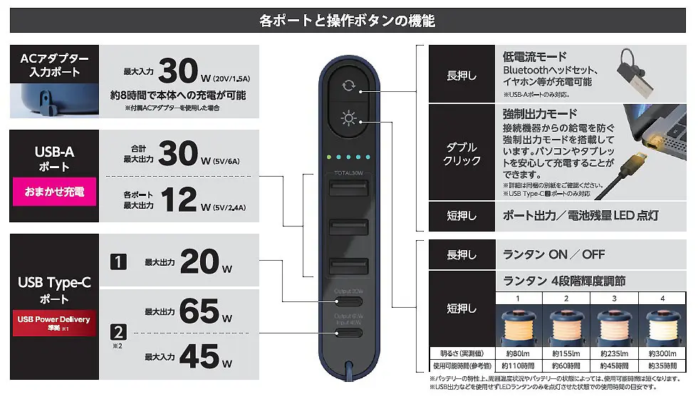 ※3:ランタンの使用や機器の接続を行っていない状態での目安の充電時間です。環境や条件によって充電時間は変化します。
