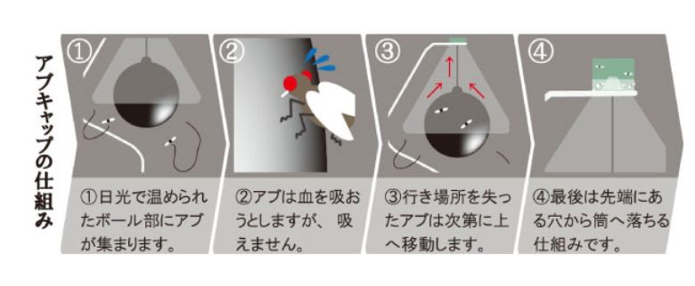 日光で熱を帯びたバルーン部に乗ってきたアブは、血を吸おうとバルーンの上を歩きまわり、次第に上に上がっていく。上部にある筒は、アブが一度入ったら出れない仕組みになっており、これにより薬品や電気を使用することなくアブを駆除することができる。