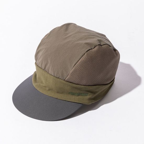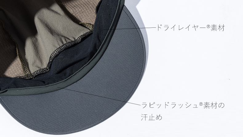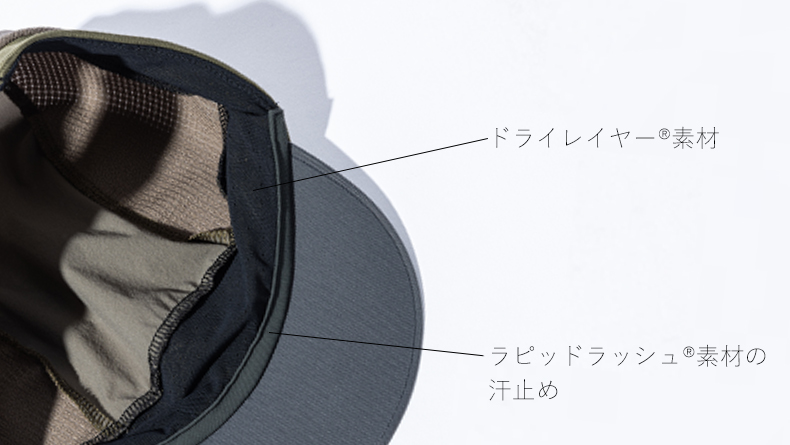 ウエアと同じ「ドライレイヤリング」のメカニズムを搭載。汗のベタつきや濡れを抑えるため、頭囲をぐるっと一周「ドライレイヤー」素材で当て布し、その表側にベースレイヤー素材「ドラウトタフ」を配置。肌をドライに保ち、スピーディに吸汗拡散します。