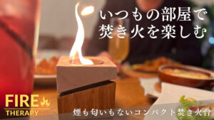 FIRE THERAPY(ファイヤーセラピー)とは一言でいうと屋内で楽しむ新しい焚き火台。煙も匂いもなく、いつでもどこでも『炎の癒やし』を楽しむことができます。