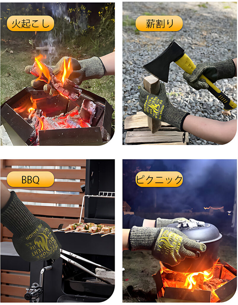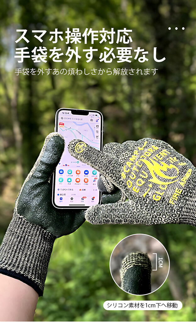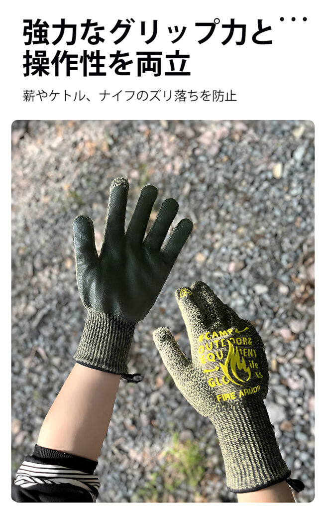 同製品は、多層構造により高い難燃性と、最大500℃の圧倒的な耐熱性を誇るアウトドアグローブとなる。スクリーンタッチに対応しスマホ操作も可能で、耐切創性も高く、ナイフで手を怪我することも防いでくれるのも特徴だ。また、洗濯機で洗浄可能なので、お手入れが簡単なのも嬉しいポイントである。