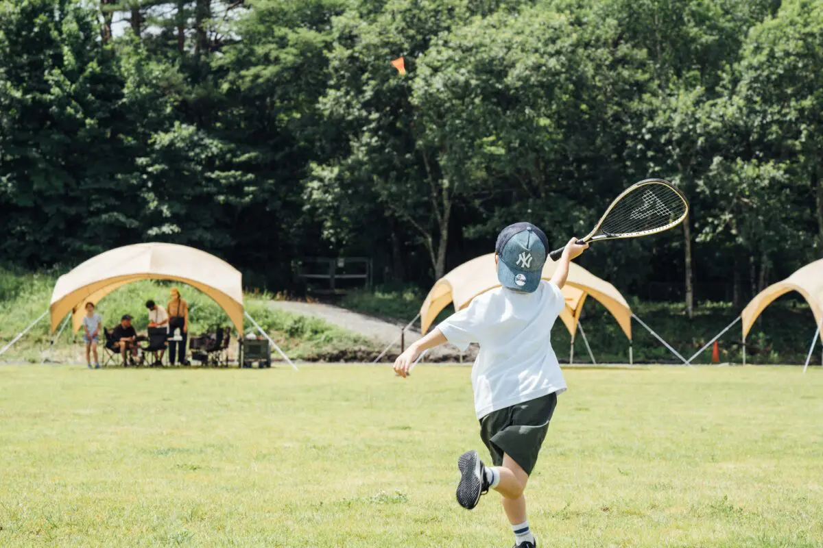 広大なフィールドエリアの外周に設置されたテントサイトの内側にある芝生スペースは、誰もが遊べるソトアソビの開放エリアです。朝方から子供達が駆け回ったり、ボール遊びや水鉄砲での水遊び、バトミントン、モルックなどで遊んだりと、キャンプを楽しむファミリーでも大勢で楽しめる巨大フィールドが広がっています。