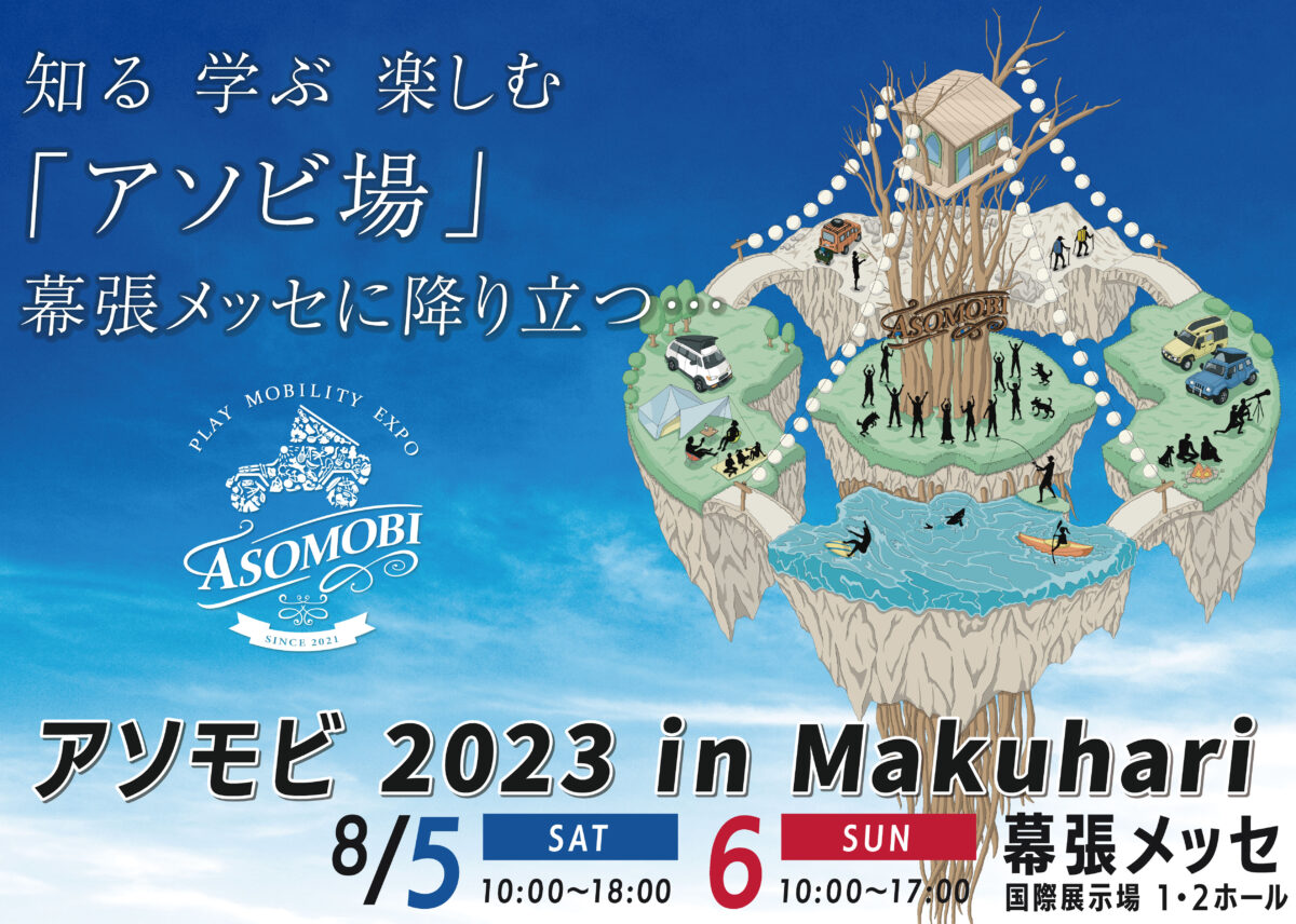 株式会社Fun timeの「アソモビ2023実行委員会」は、今回「テマヒマを楽しむ“遊び方の自由研究所”」をテーマに、希少なガレージブランドや最新のキャンプグッズ、こだわりの車中泊車や憧れのキャンピングカー、日本の伝統文化「盆踊り体験」や20種を超えるワークショップ体験が揃う“遊び方の祭展”『アソモビ2023 in Makuhari』を、2023年8月5日(土)と6日(日)の2日間、幕張メッセで開催します。