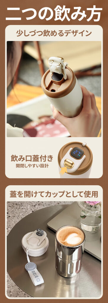 蓋を開けてカップとして使用する方法と、飲み口を開けて水筒として使うこともできます。