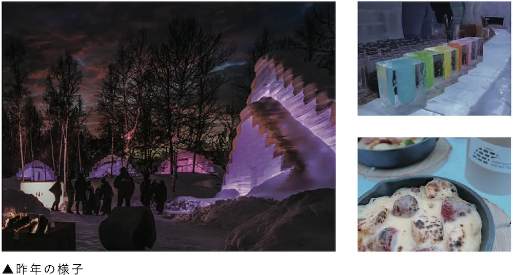 冬の北海道を舞台に、北国の冬と、そこにある暮らしを氷と雪の幻想的な世界の中で食 ・アート・カルチャーを楽しむ冬季観光コンテンツとして2014年当別町からスタートした ICE HILLS HOTELから10年目を迎え、2018年からは北海道屈指のリゾート地である キロロリゾートに開催場所を移し、札幌北3条広場での「SAPPORO YUKI TERRACE 」、世界自然遺産の地である知床での「知床流氷テラス」、2020年初開催となる道南の 七飯町での「大沼アイスカルーセル」と全道的にて展開。冬のはじまりから製作し、春の 雪融けとともに終わるICE PROJECTは長く厳しい北海道の冬において、その魅力を再認識し、新たな楽しみを提供することで国内外から多くの注目を集めて参りました。 2022年から芸森ワーサムを拠点に冬のメインコンテンツとして開催しております。
