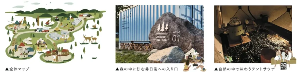 春は新緑の芽生えとともに、夏は緑豊かで涼しく、秋は収穫された美味しい食材の恵みと、冬は真っ 白な幻想的空間など、四季折々の楽しみが満載の北海道を背景に4つの滞在スタイルをご用意いた しました。アウトドアでありながらホテルの快適さとプライベートサウナを備えた「TINY HOTEL」、 Sʼmore社製グランピングテントにウッドデッキを配置した「GRAND TENT SITE」、林間エリアに は骨太な山小屋をイメージした木製の「CABIN」と、ご自身のお気に入りキャンプギアをお持ち込み いただき楽しめる「FOREST TENT SITE」の4つの施設で、ご利用スタイルに合わせたプランで皆 さまをお迎えいたします。 宿泊に限らずデイユースでのアウトドアも満喫いただけるよう、自然の中で味わうテントサウナや、 薪割りからファイヤーピットでの焚き火、フィンランド発祥のゲーム「モルック」などのアクティビティ 体験もご用意しております。デイキャンプやご宿泊時の食事は、各季節ごとに地元食材を中心に使 用したバーベキュー。自分で作るキャンプの醍醐味はそのままに、ウエーバー社製の本格グリルで快 適に食事をお楽しみいただけます。また、お泊まりでの朝食では、地元食材を使用したホットサンド ウィッチとハンドミルでのオリジナルブレンドコーヒーをお召し上がりいただけます。