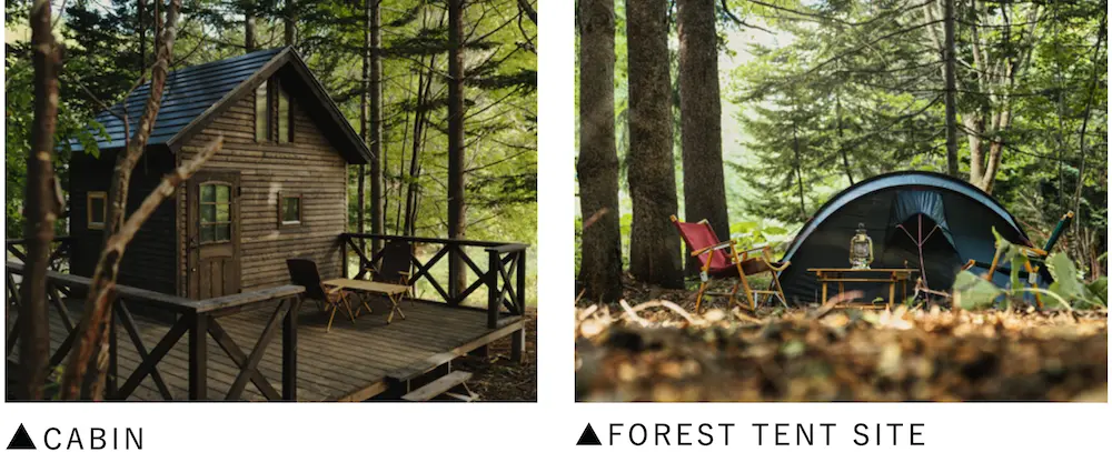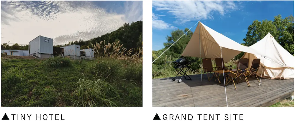 TINY HOTEL 19,500円~ / GRAND TENT SITE 15,000円~ / CABIN 15,000円~ / FOREST TENT SITE 9,000円~