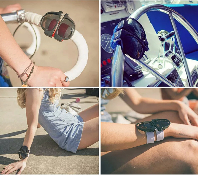 スポーツやアウトドアでサングラスの置き場所・収納場所に困ったことはありませんか?GeeShadesは手首や自転車に巻き付けたりできます。