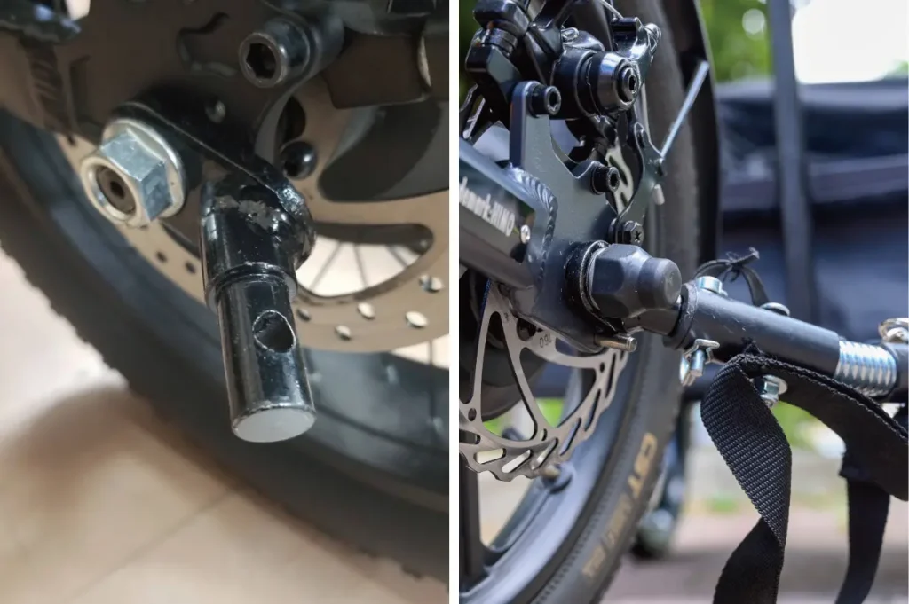 自転車への装着は、まずは後輪のナットを外して装着用のアタッチメントを取り付けます。