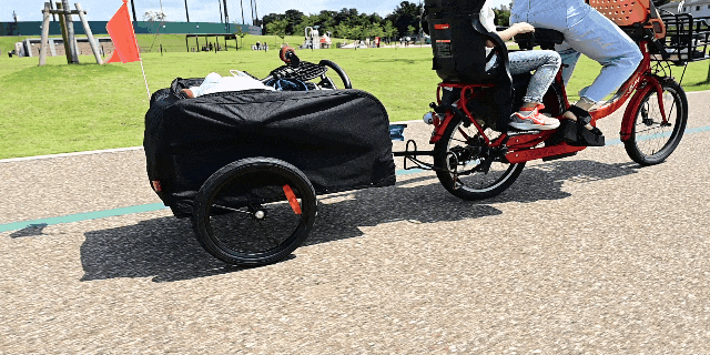 Go Box+を使えば、3輪自転車と同じ構造になるので車体も安定しますし、子どもを乗せたまま多くの荷物を運搬することができます。
