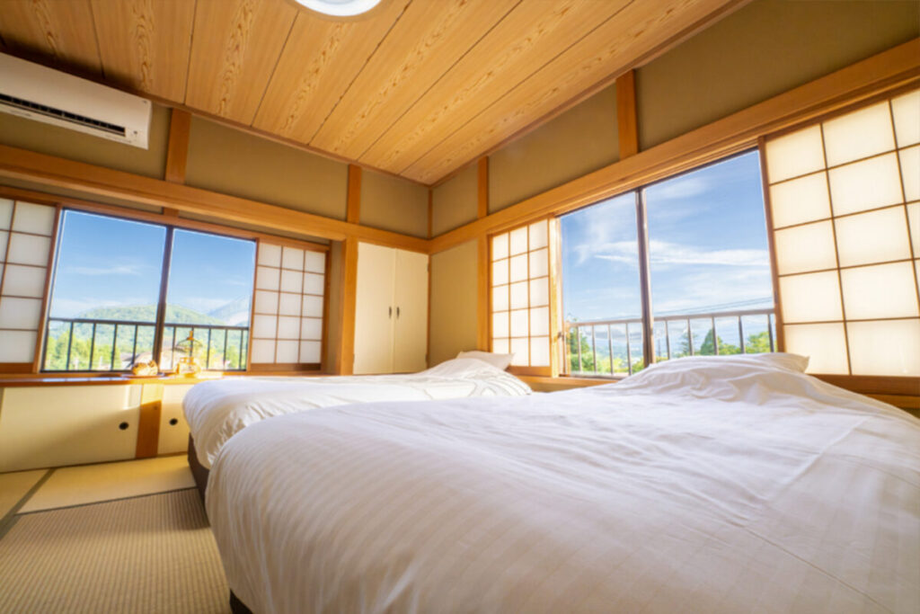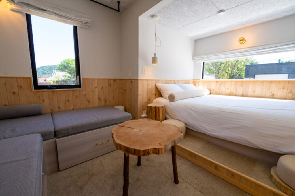 1棟貸切の古民家風ヴィラは1日1組限定、最大定員10名とグループやファミリー利用に最適な客室は2階建ての広々とした空間が広がります。フルリノベーションした客室空間にはワインセラーや専用の冷凍ストッカー、空気清浄機など充実した設備に大人数でもくつろげるインテリア。 2階からは大涌谷の絶景も見渡せます。グループ利用で個性的なホテルライク×手軽なアウトドアをお楽しみ頂くには1棟貸切ヴィラがおすすめです。