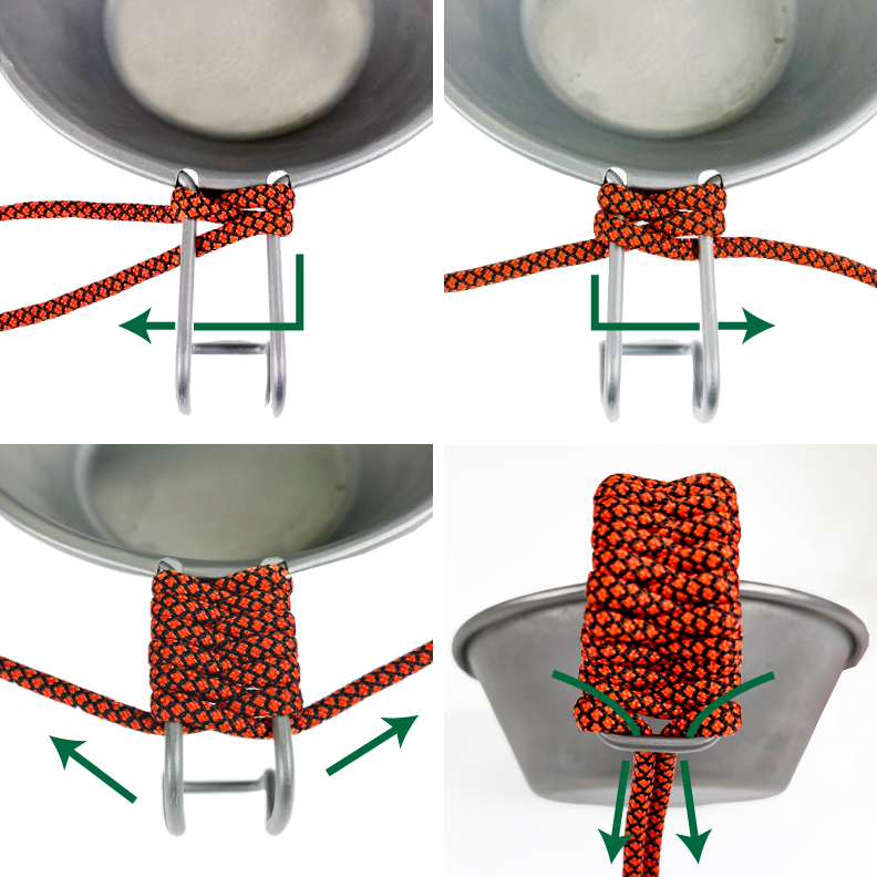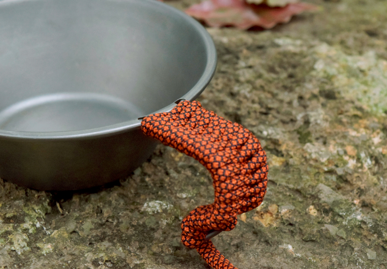シェラカップやザック、斧やナイフのハンドルに④編み込んでカスタマイズすることもできます。シェラカップならハンドルが熱くなりにくいので持ちやすく、ザックや斧は汚れ防止や滑りどめの効果も期待できますよ。簡単に編めるので、汚れたらすぐ取り替えられる気楽さも魅力です。