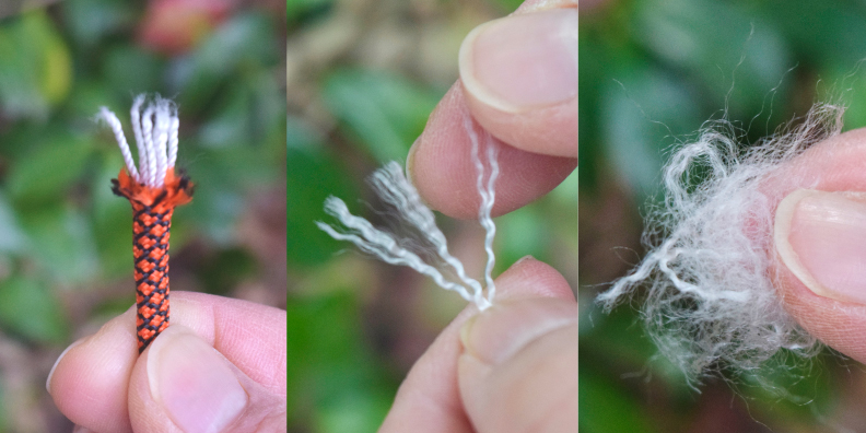 なんとパラコードは③着火剤としても使えることをご存じでしたか?内芯を取り出して撚りをほどけば、火おこしに使える火口となるんです。