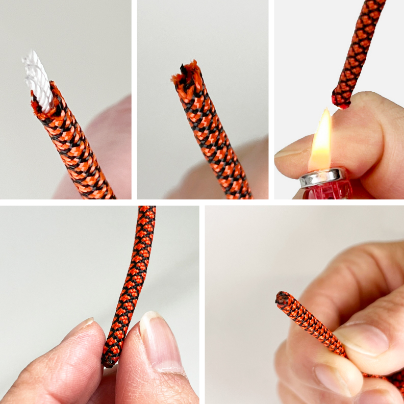ポイントは、パラコードの内芯である白い紐を2mm程短くカットすること。内芯が見えないように外側のコードで内伸を包み込み、切り口をライターで軽く炙り、少しづつ溶かして切り口をふさぎながら形を整えていきます。このとき指を火傷しないように気をつけてくださいね。