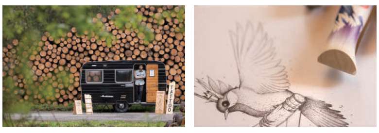 山と森に囲まれて育ち、自然を愛するジェレミー。アウトドアタトゥートラックで旅をして、出会った風景や動植物からデザインの着想を得ている。