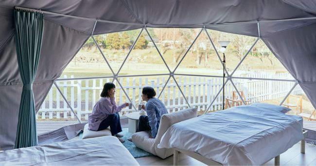 三密回避で、新たな体験型宿泊施設として認知されたグランピング施設と、古き良きおもてなしサービスを誇る旅館・ホテルを掛け合わせた新しいスタイルのグランピング施設を全国各地に展開しています。