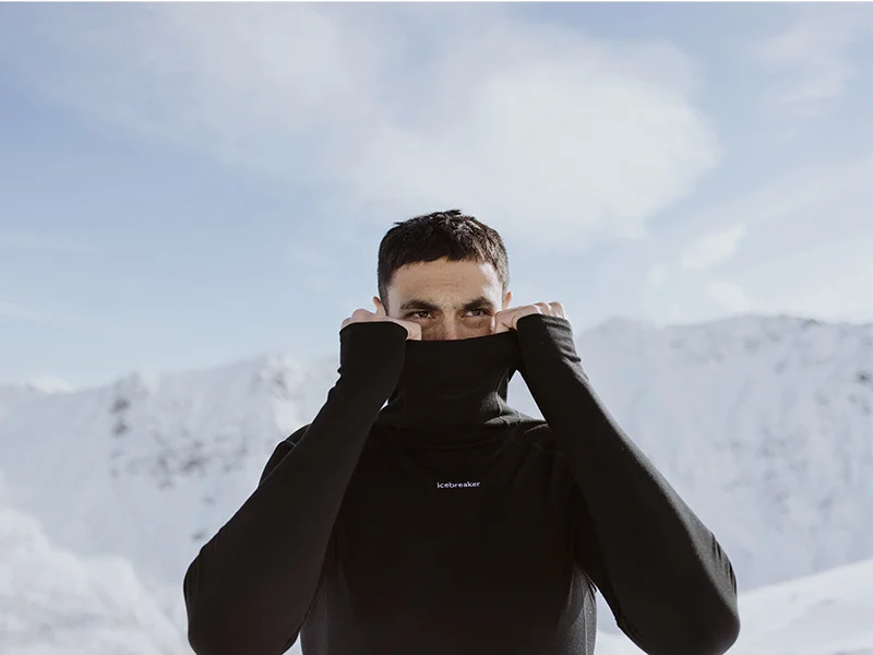 本製品は、icebreakerで最も細くソフトな15.5マイクロンのスーパーファインメリノの300ウェイト素材を使用。肌あたりも優しく、厳冬期の気象条件下で衣服内環境を快適にし、ハイネックにすることで首回りの保護性を担保、ラグラン袖の運動性やサムループによる手首の保温性など機能面でも快適性を追求しています。