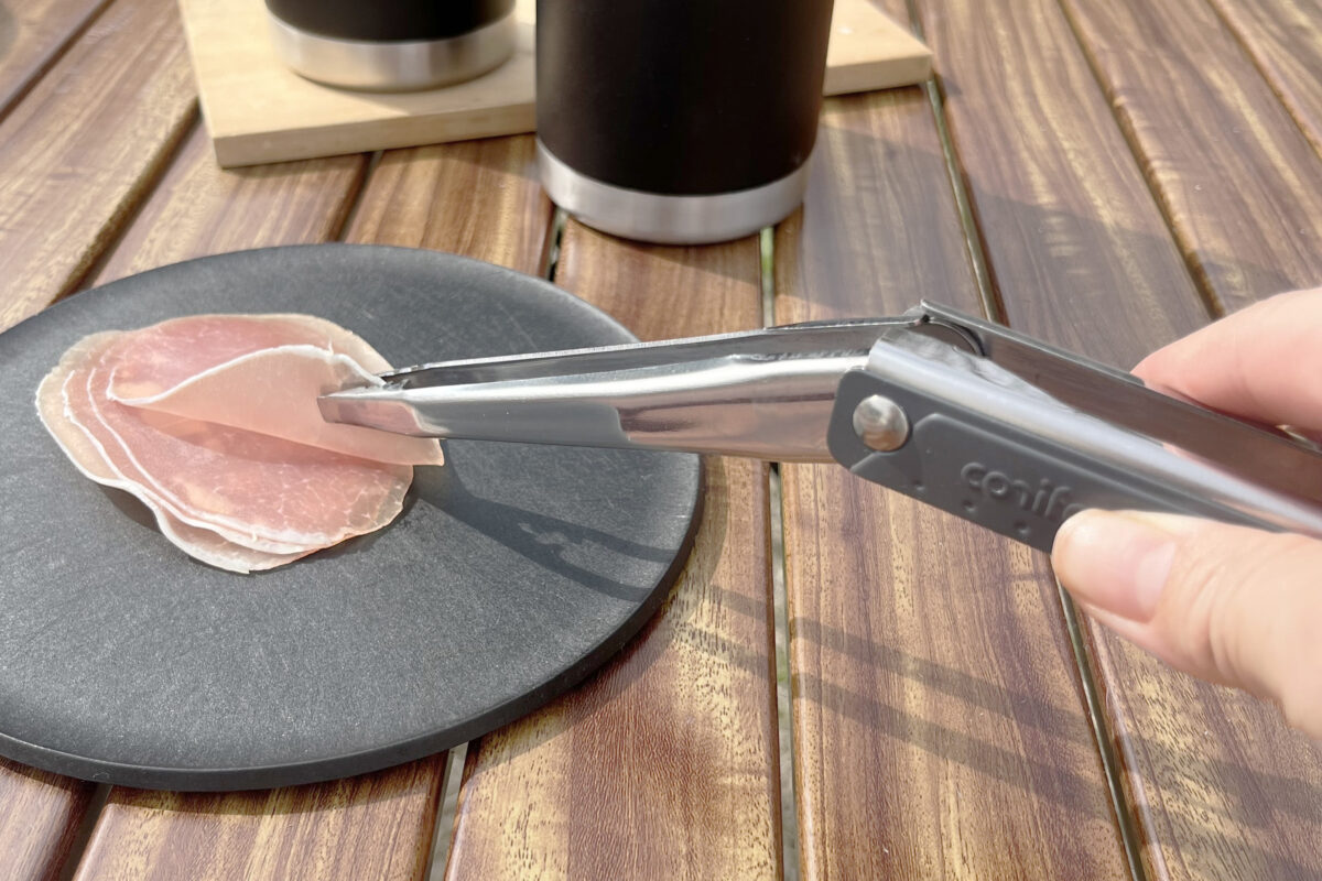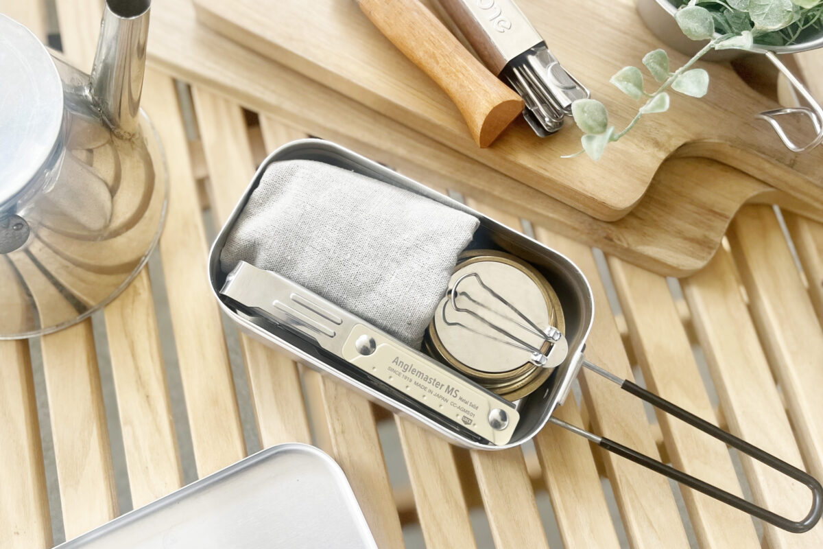 メスティンにも収まる超スリムサイズで収納場所を選ばず、 荷物の量を増やしません。 使いやすさはもちろんのこと、 開閉時のギミックや金属のギア感、 デザイン性の高さは、 他の折りたたみトングとは一線を画します。