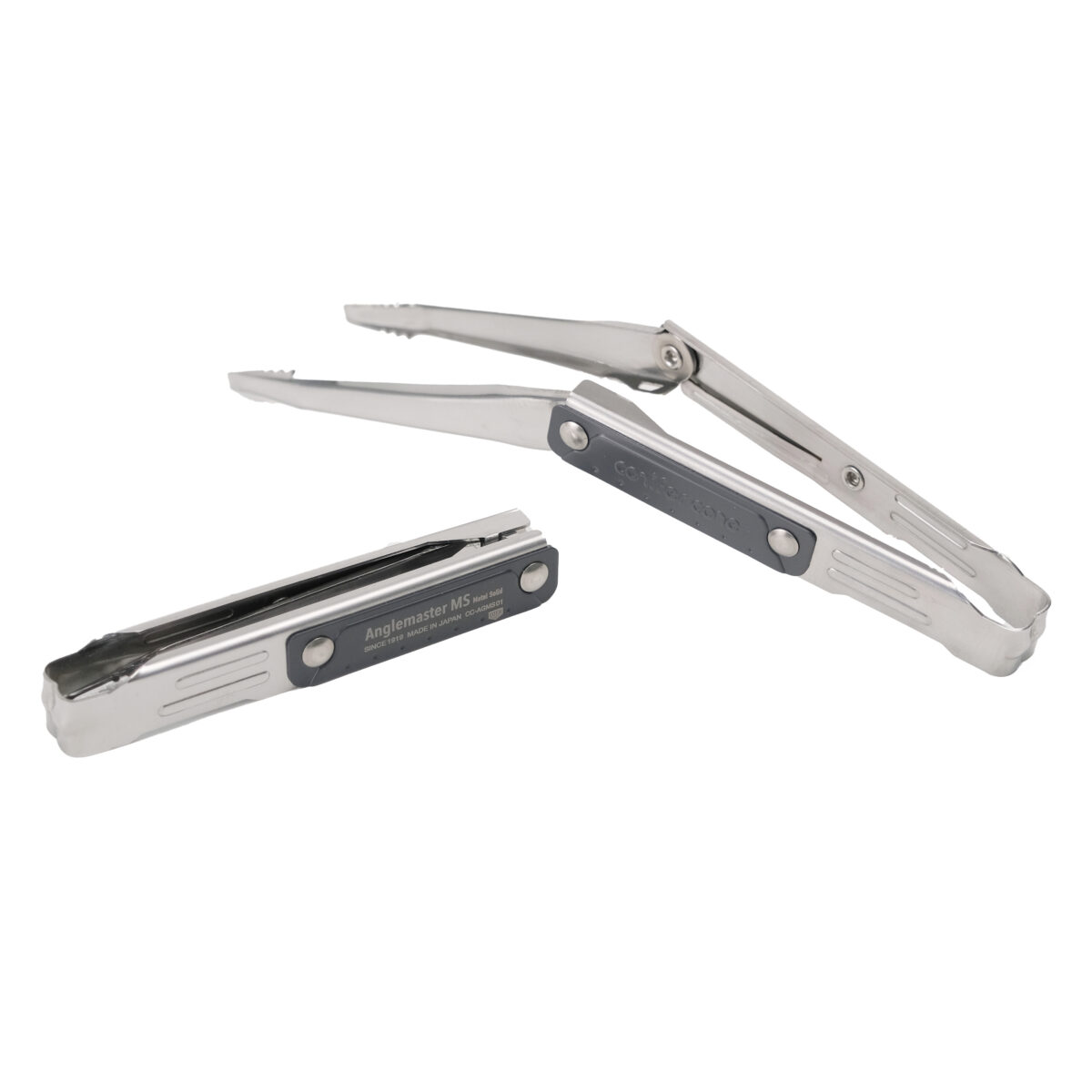 「アングルマスター MS」 は、 conifer cone のラインナップの中でも人気アイテムであった折りたたみトング「アングルマスター」 をさらに使いやすく進化させた新しい折りたたみトングです。 「MS」 は 「Metal Solid(金属の塊)」 の意。 金属から削りだしたような重厚な質感と、 コニファーコーンらしい変形ギミックで発売以来ご好評を頂いております。