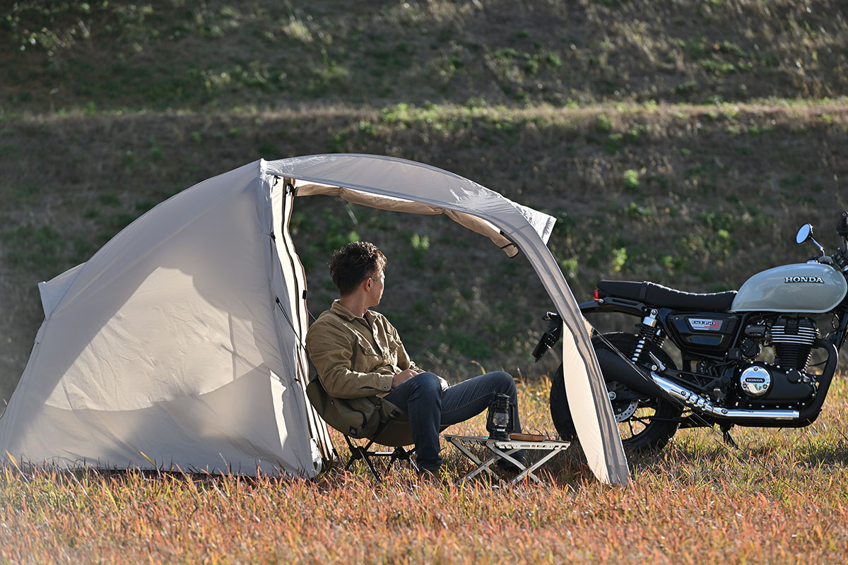 名前の通り、前室の広さが一番の特長です。前室にある3つのパネルを閉じても、ぎりぎり2人が座れるぐらいのスペースがあり、ソロキャンプなら、イスとテーブル、シートバッグを置いても余裕の広さです。キャンプツーリングは車のキャンプと違い、雨が降ったら荷物を一時避難させたり、車の中で過ごしたりできません。テントに前室がなければ、寝袋に入って、テントの中でぼんやり過ごすだけということも。雨の日でもと言うと大げさですが、どんな環境でも楽しくキャンプをしていただきたいですし、前室が広いことでキャンプの楽しみ方もグッと広がるそんなテントです。