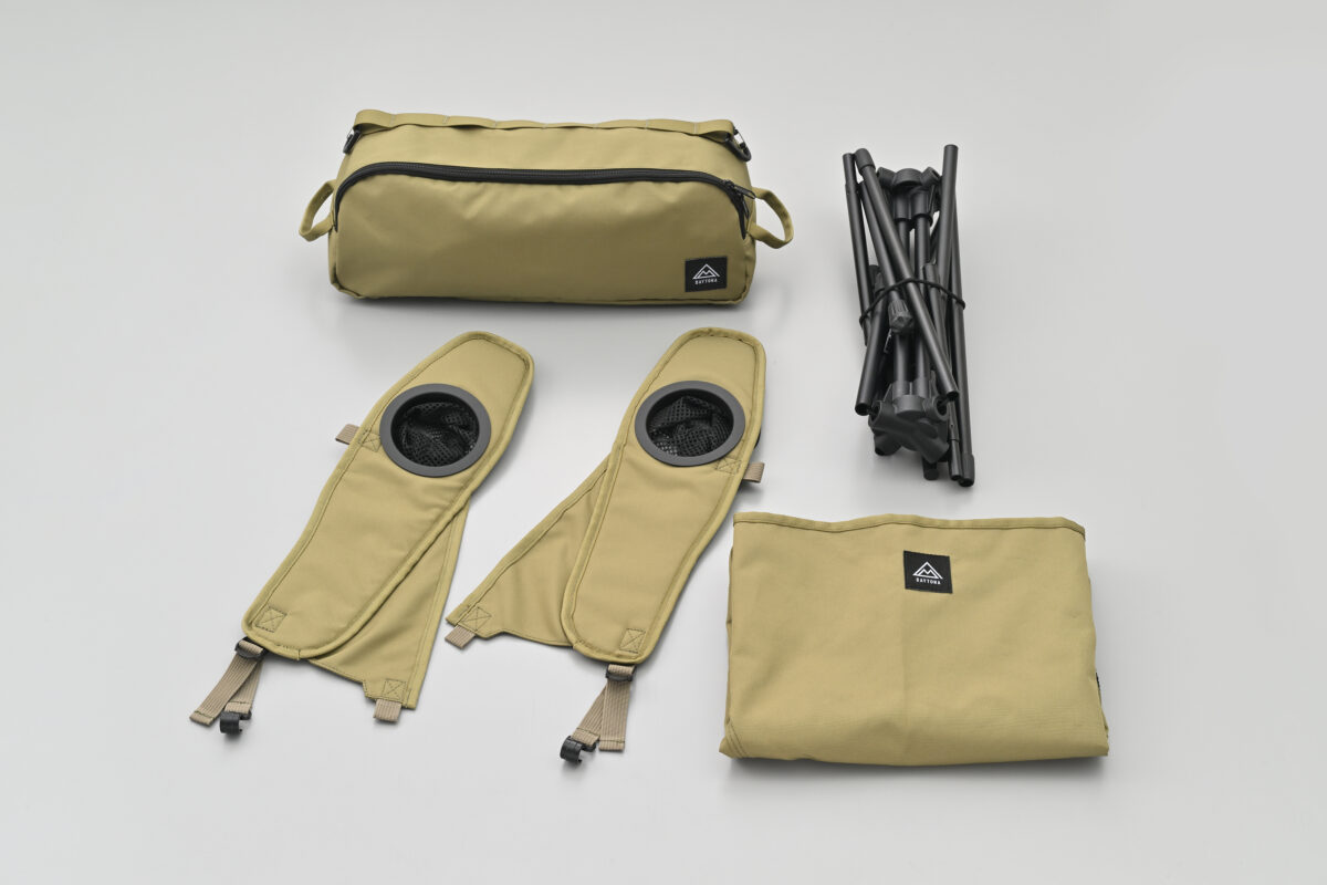 特許出願中!コンパクトながらひじ掛け付きのチェア。収納袋はカラビナ付きでチェアのパルステープに取り付ければ便利な小物入れへ
