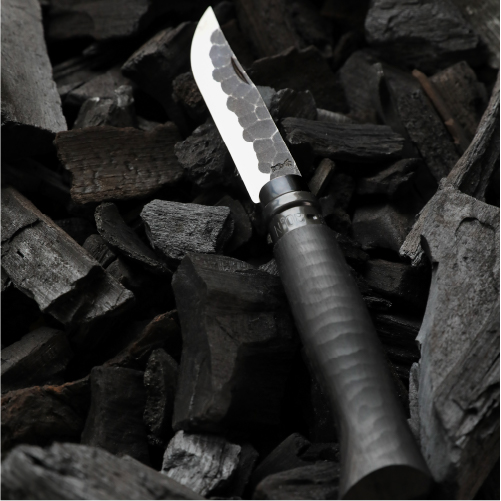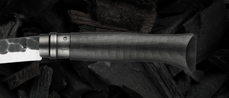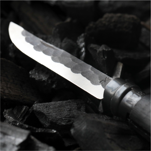 ハンマーで打ち付けたような槌目模様のブレードは、優れた切れ味と研ぎやすさが特徴の高炭素鋼から鍛造。 更にエッジのみ滑らかに研削する「brute de forge(ブルート ド フォージ)」加工が施されています。 刃身には「王冠を頂く手」のマークのみがシンプルに刻まれています。