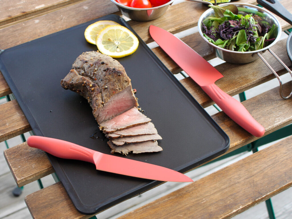 明るいカラーの包丁ならアウトドアでも大活躍!テーブルでも目立つので小さなお子様がいるキャンプでもお使いいただけます。