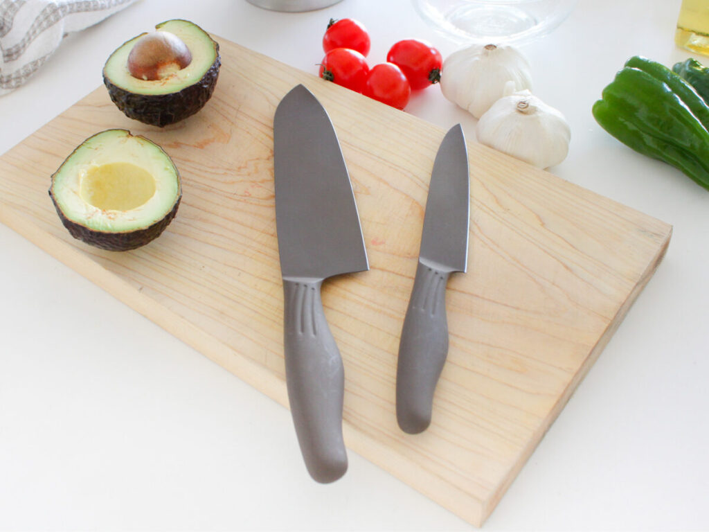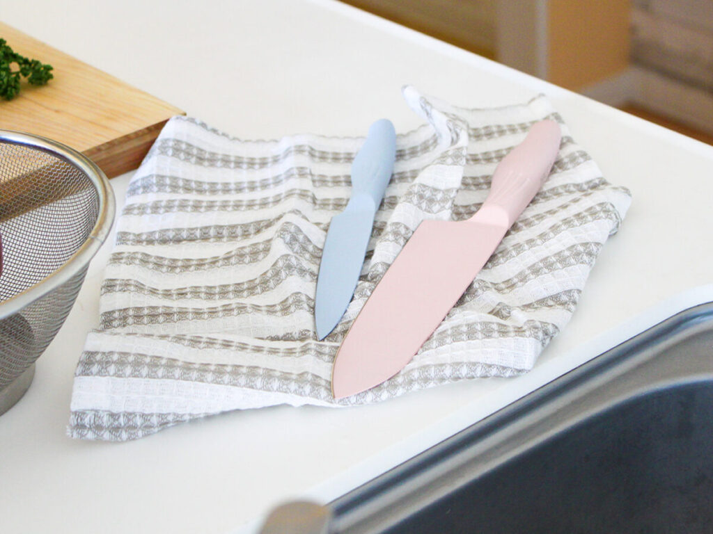 オールマイティに使える三徳包丁とサッと手軽に使えるペティナイフの2サイズ。フッ素塗装で食材もはがれやすく、お手入れもしやすいです。使うシーンに合わせて包丁も楽しくコーディネートできます。