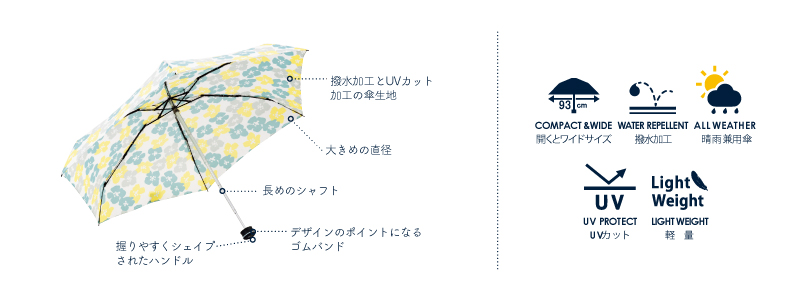 HUS.の全ての傘生地にUVカット、撥水加工を施しています。UVカット加工は紫外線を90%以上カット、撥水加工は表面の水を弾き、生地の染み込みを防ぎます。 両方の効果があるため晴雨兼用傘として使用可能。雨でも日差しが気になるときでもマルチに対応します。